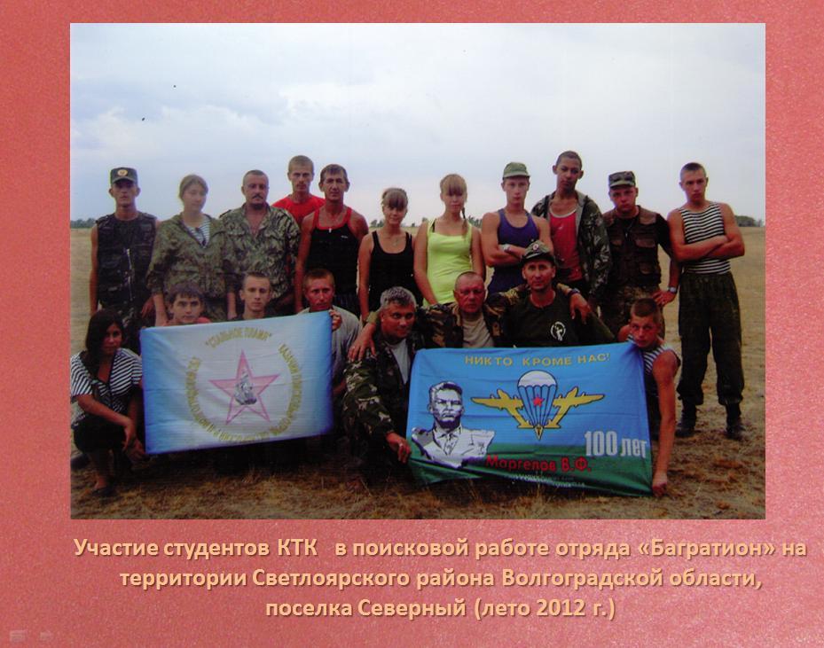 Поискова работа в Камышинском техническом колледже организуется и проводится кружком "БАРС". Студенты принимают активное участие в работе военно-поискового отряда "БАГРАТИОН".