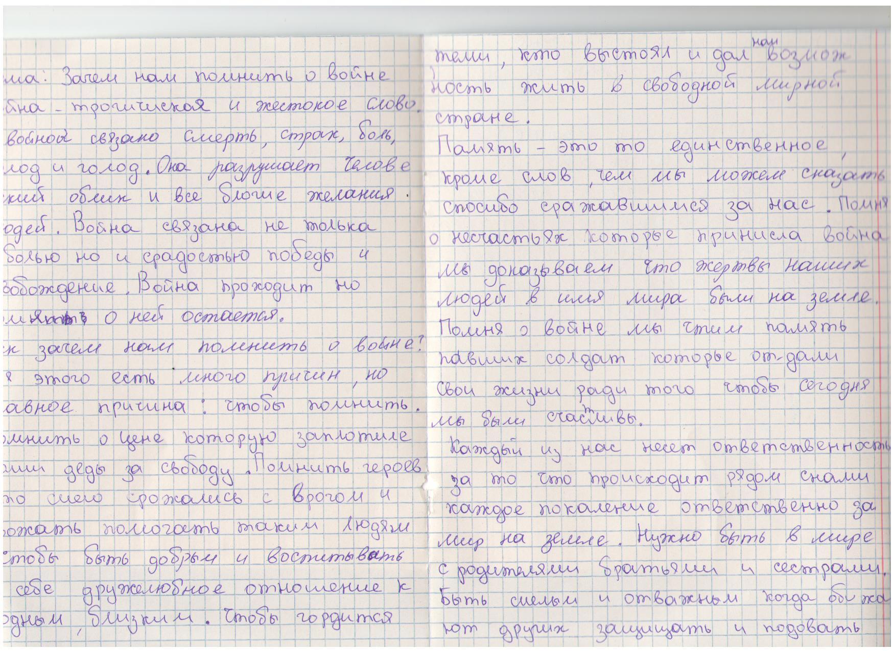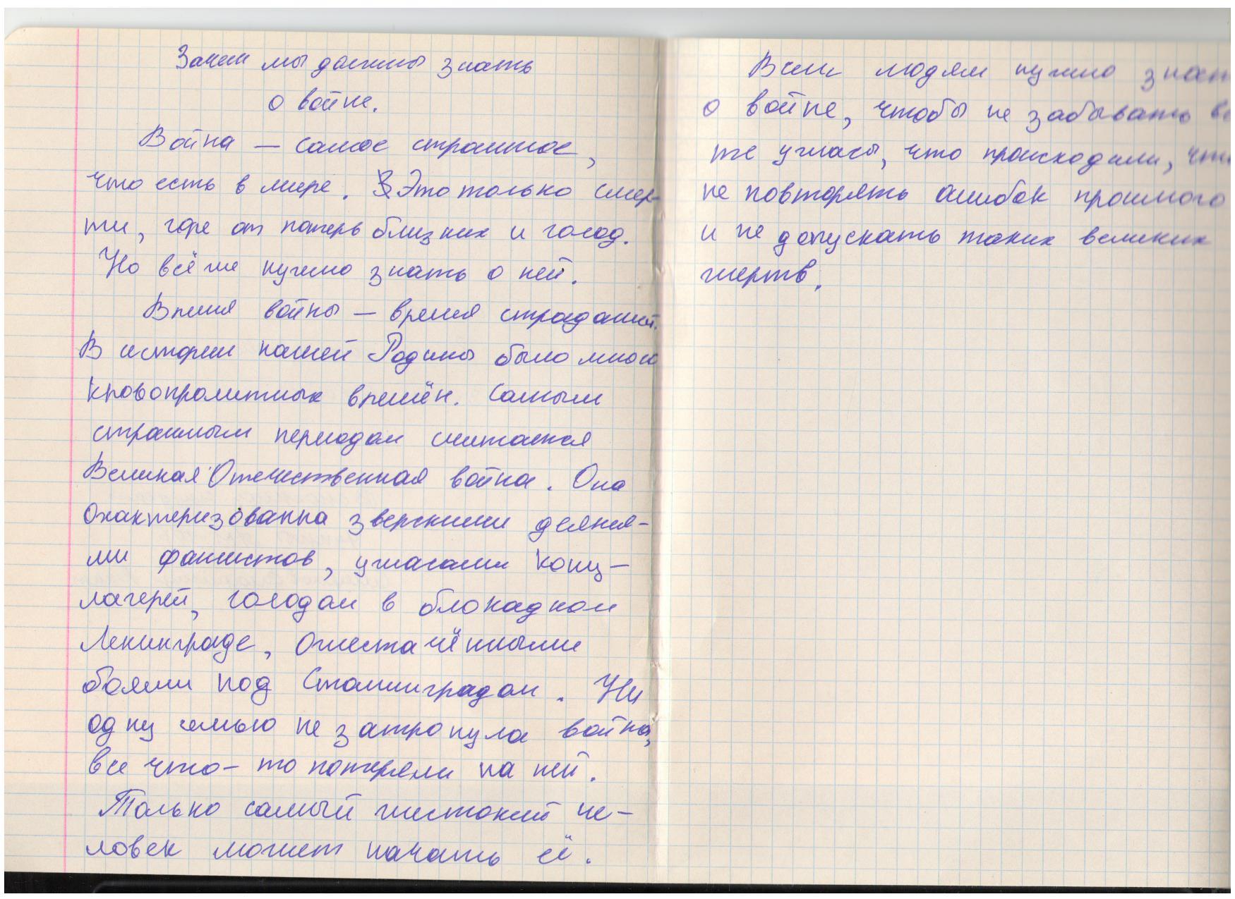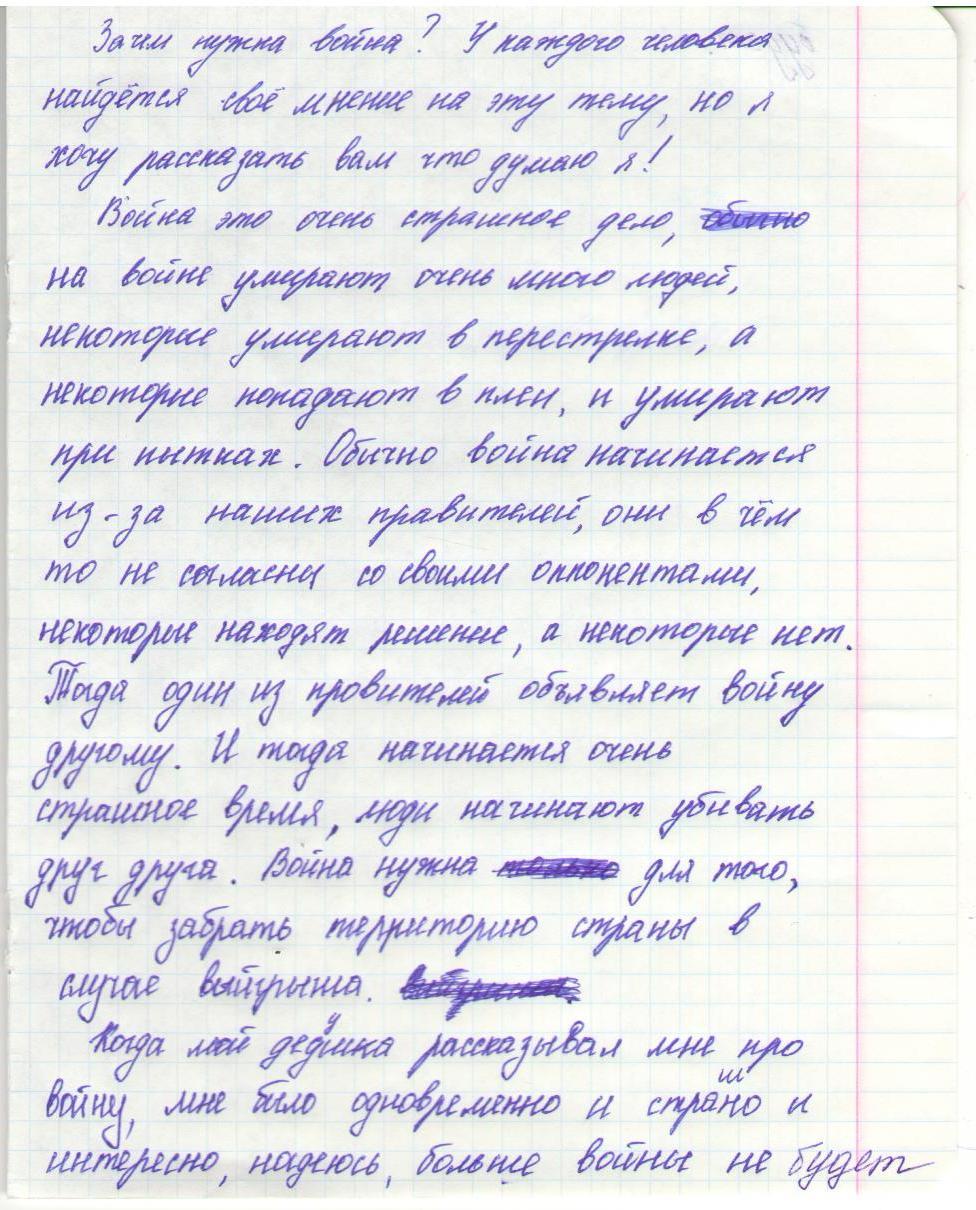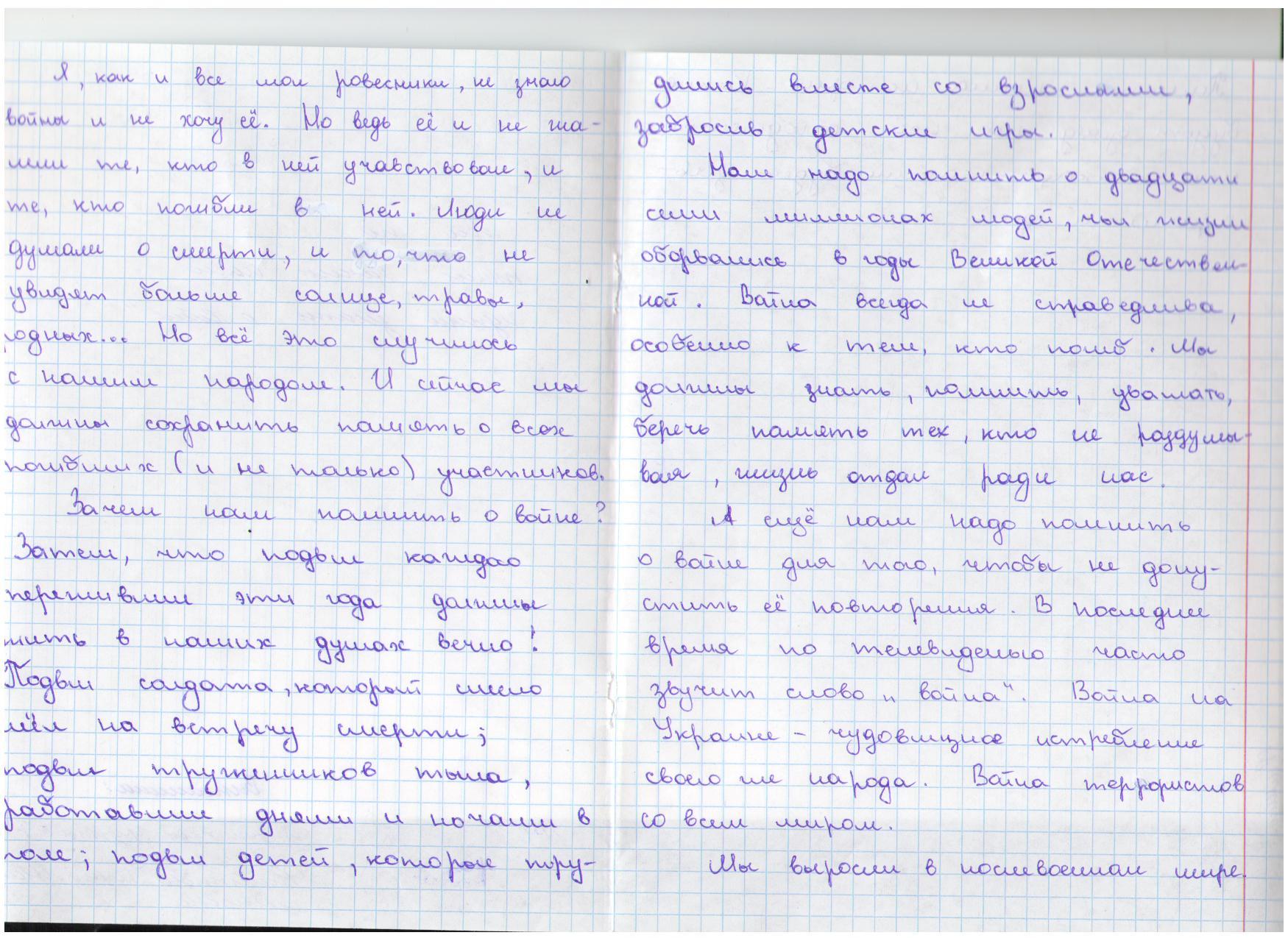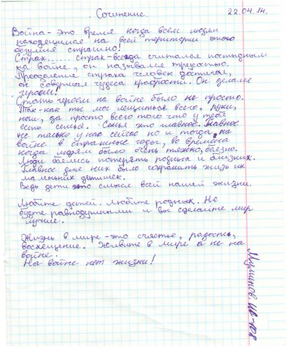 В своих работах ребята размышляли о причинах войны, последствиях, высказывали свое мнение. И единодушно пришли к такому выводу, что спорные вопросы нужно решать мирным путем, жить нужно в мире.