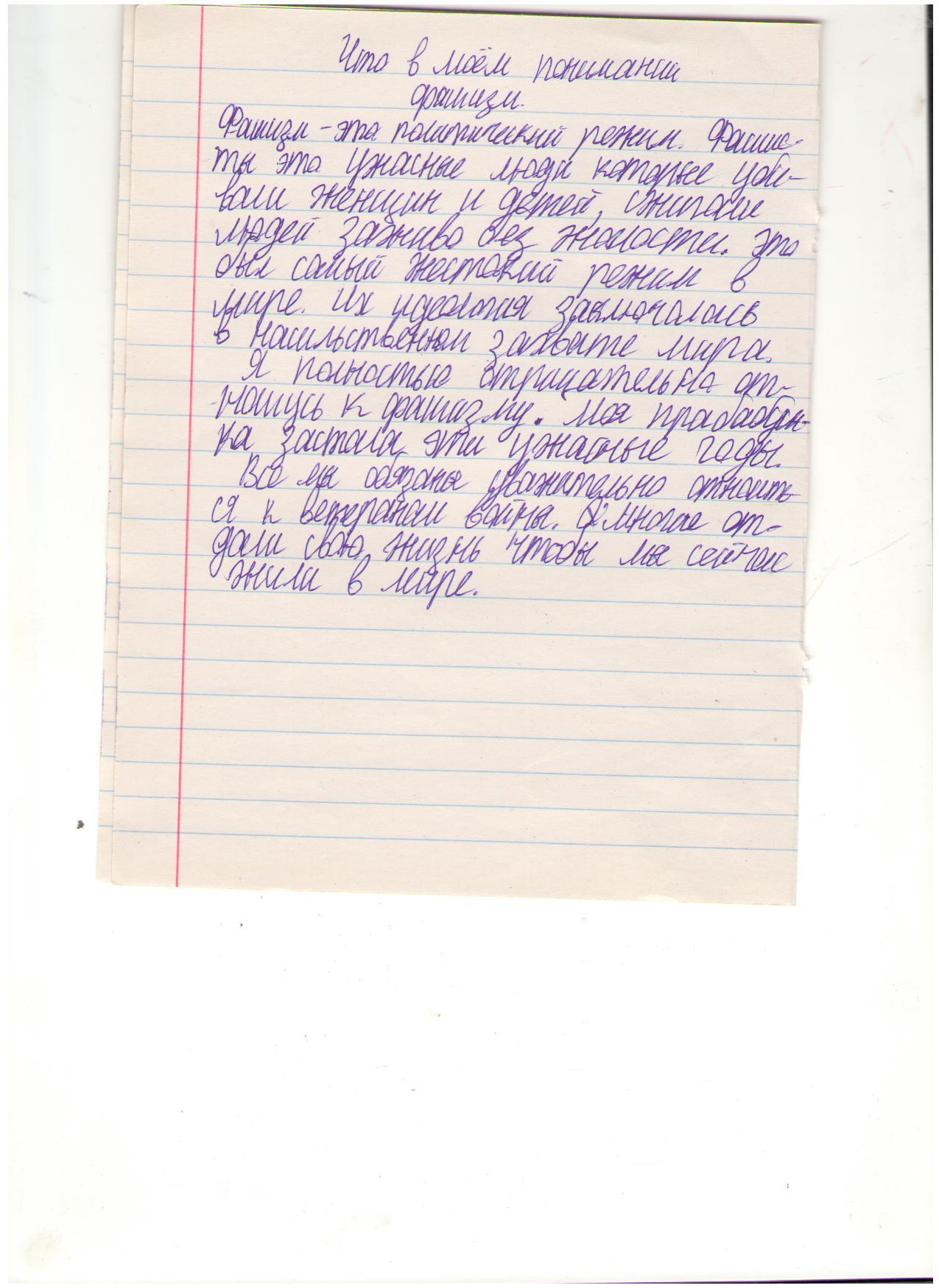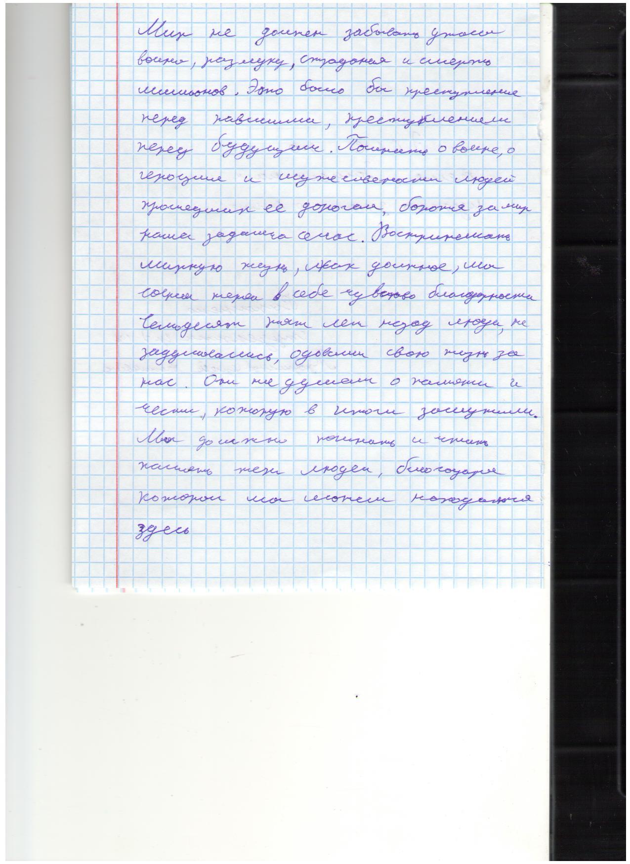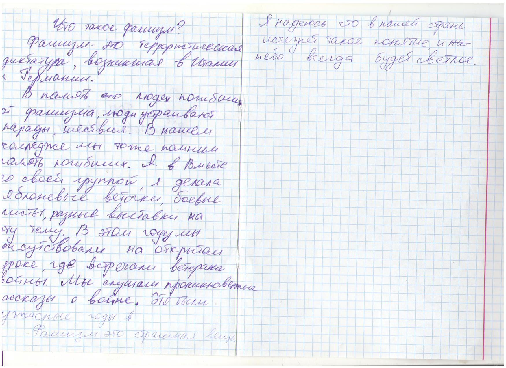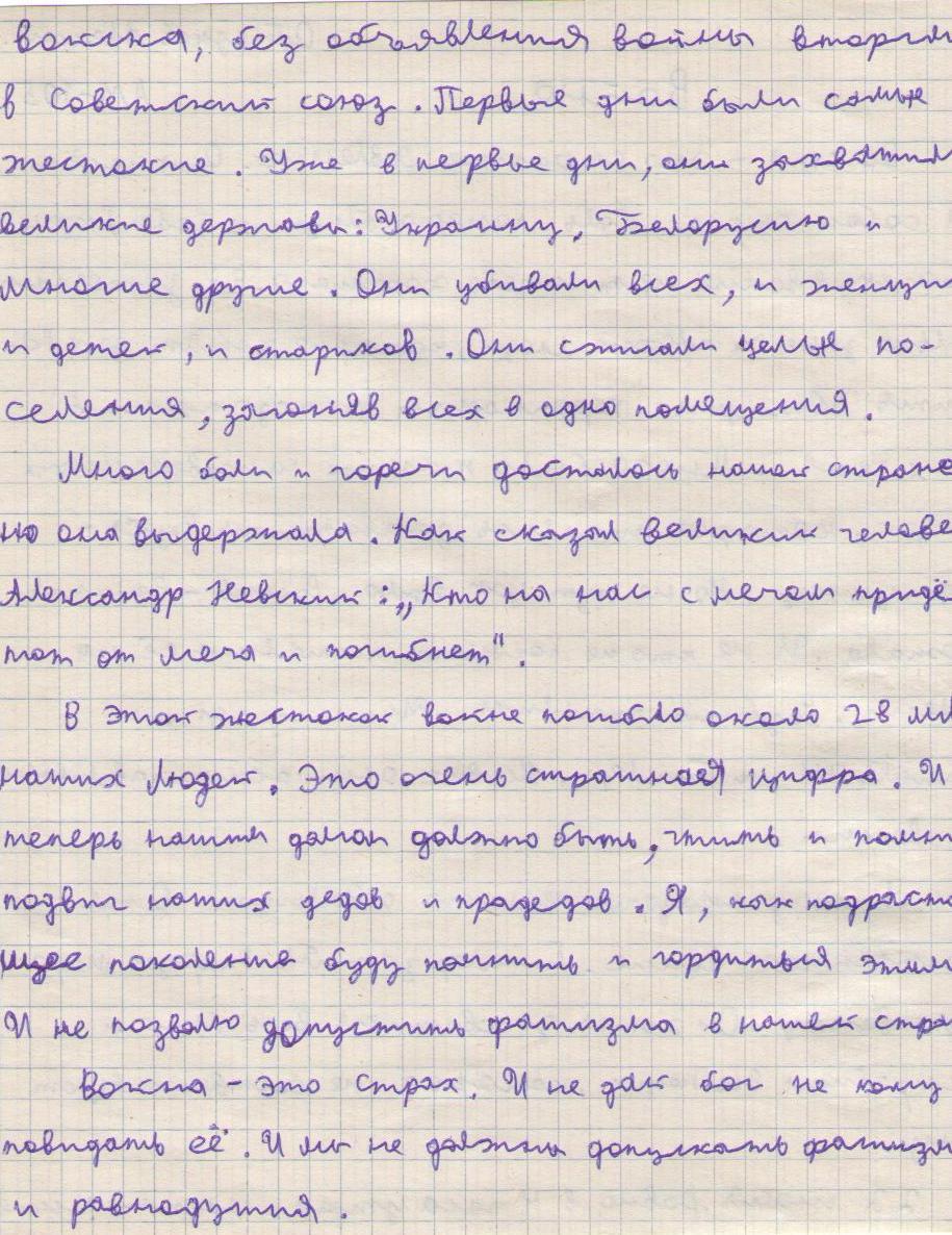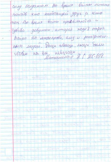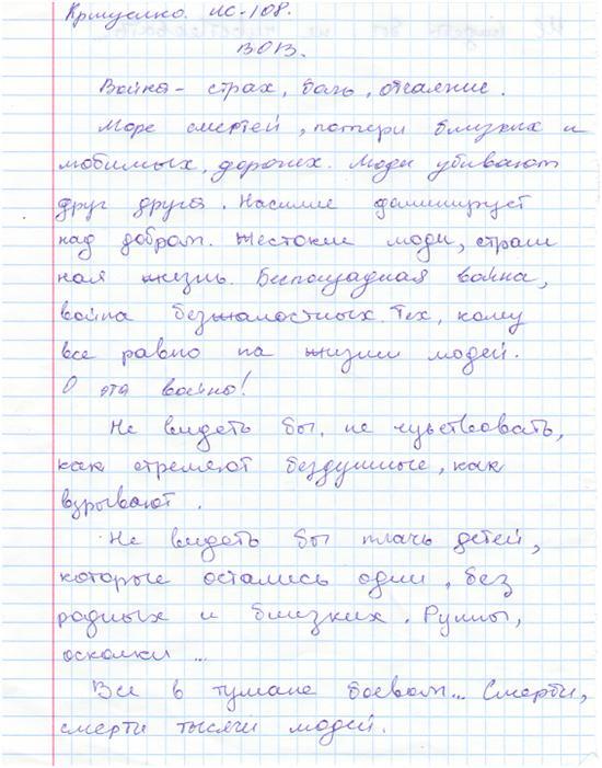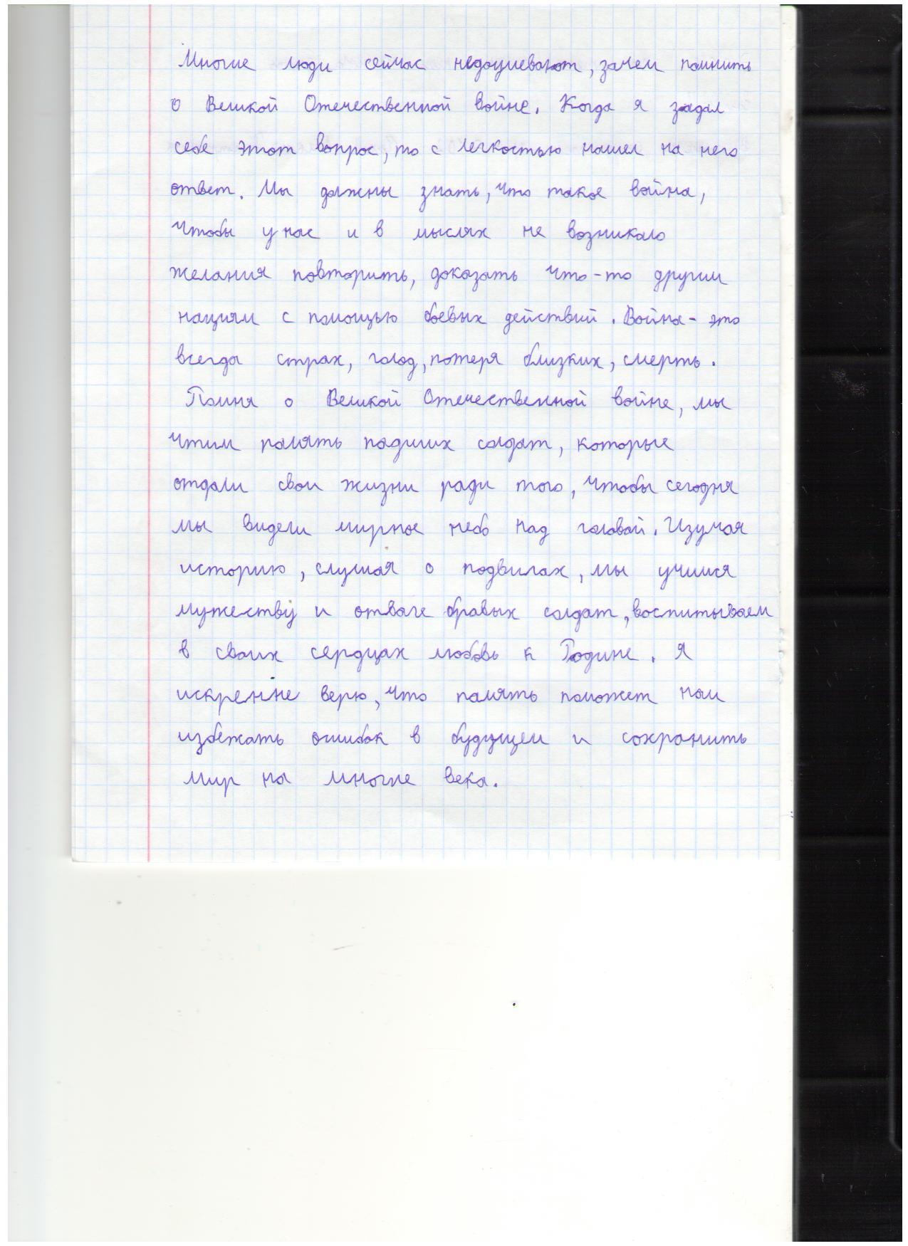 В своих работах ребята размышляли о причинах войны, последствиях, высказывали свое мнение. И единодушно пришли к такому выводу, что спорные вопросы нужно решать мирным путем, жить нужно в мире.