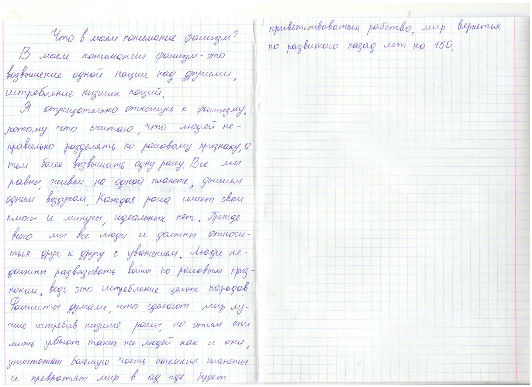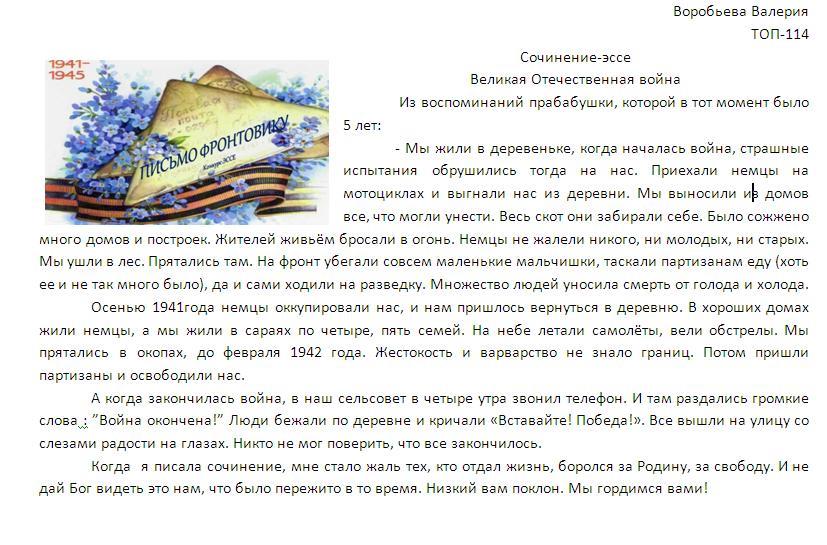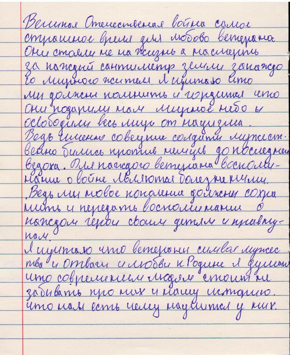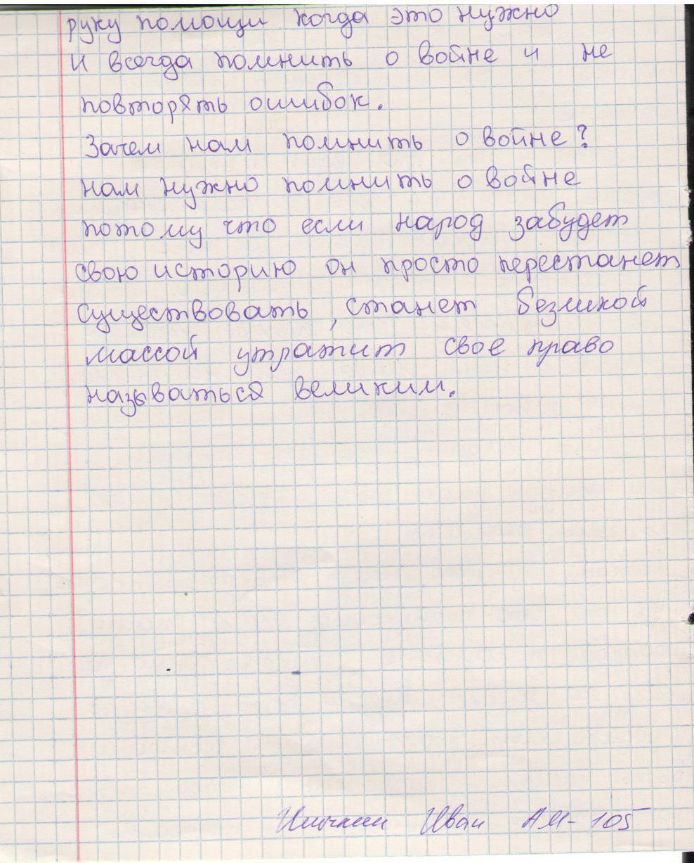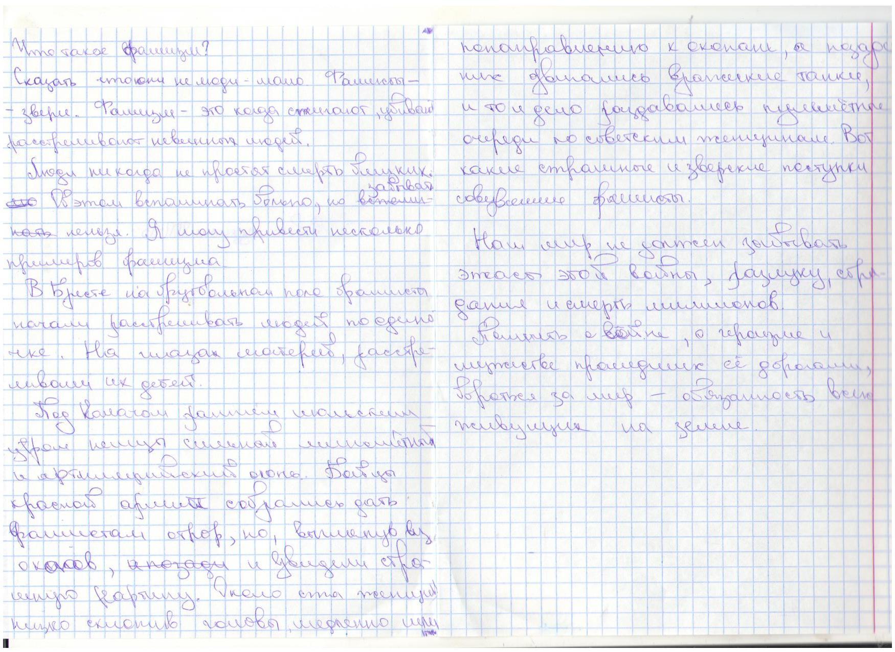 В своих работах ребята размышляли о причинах войны, последствиях, высказывали свое мнение. И единодушно пришли к такому выводу, что спорные вопросы нужно решать мирным путем, жить нужно в мире.