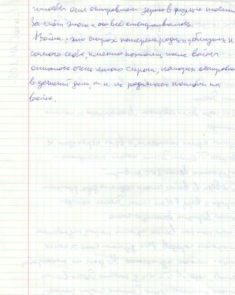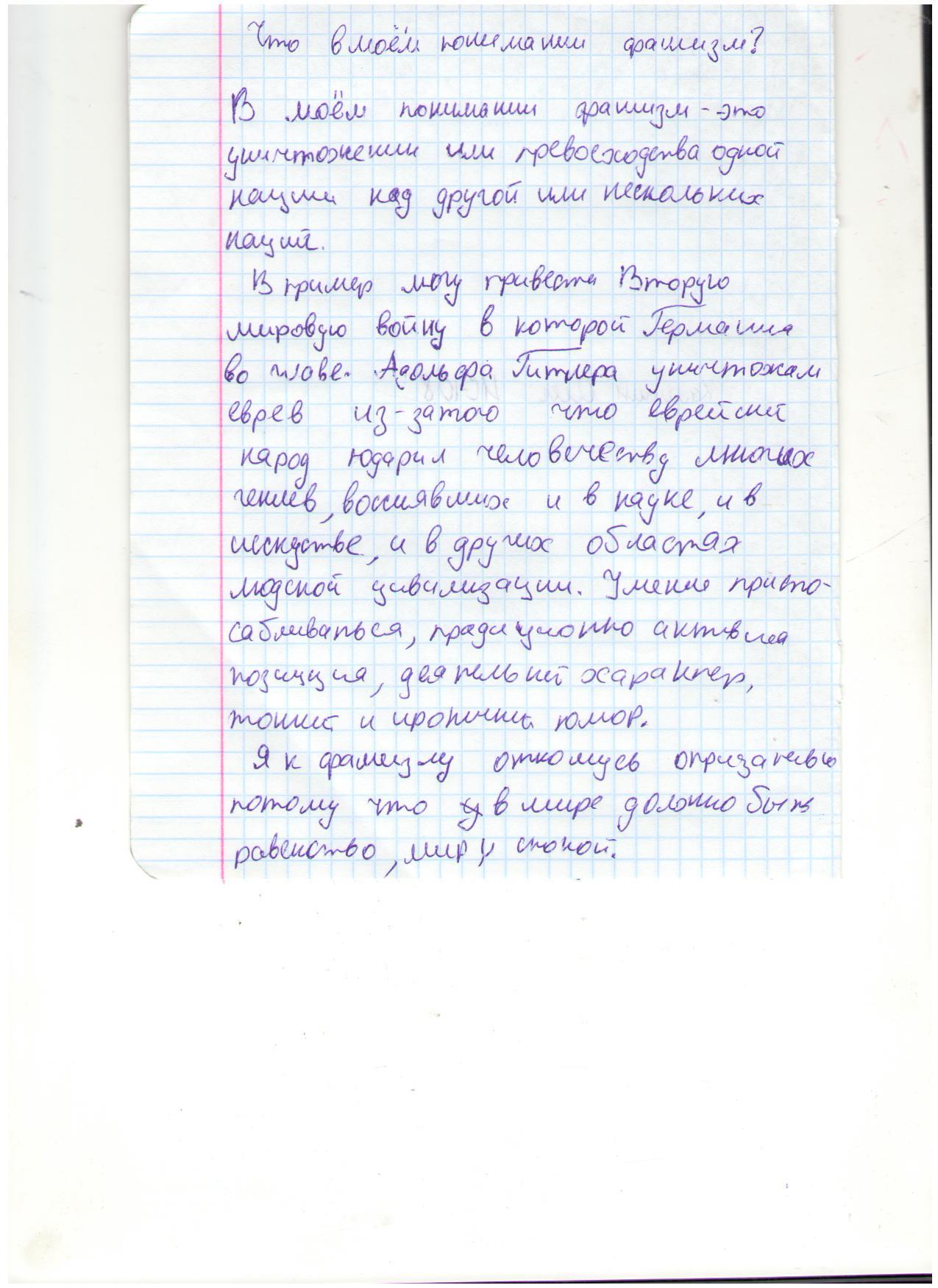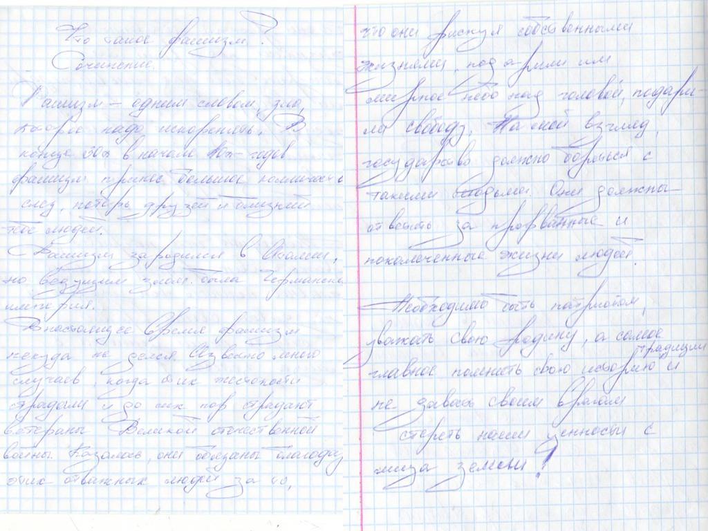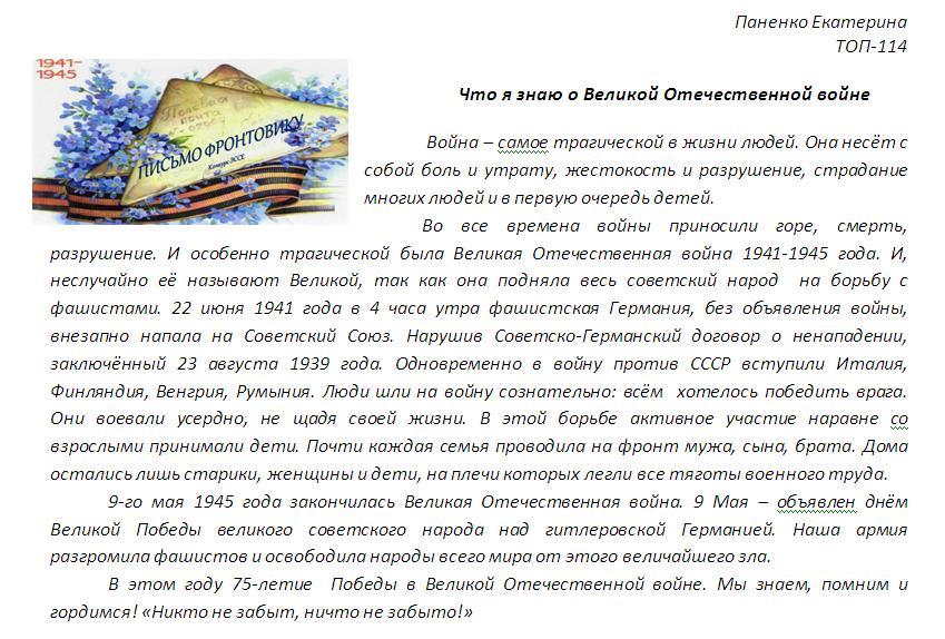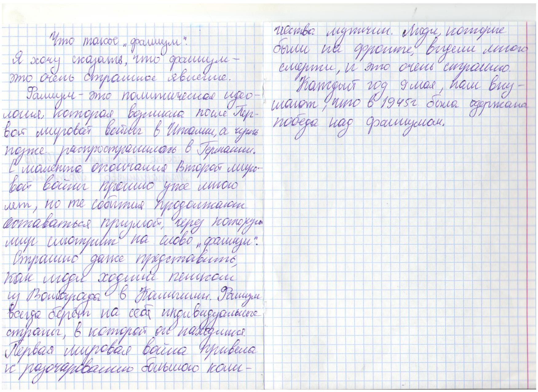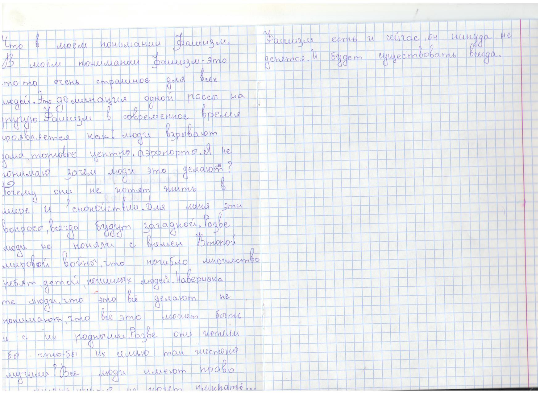 В своих работах ребята размышляли о причинах войны, последствиях, высказывали свое мнение. И единодушно пришли к такому выводу, что спорные вопросы нужно решать мирным путем, жить нужно в мире.